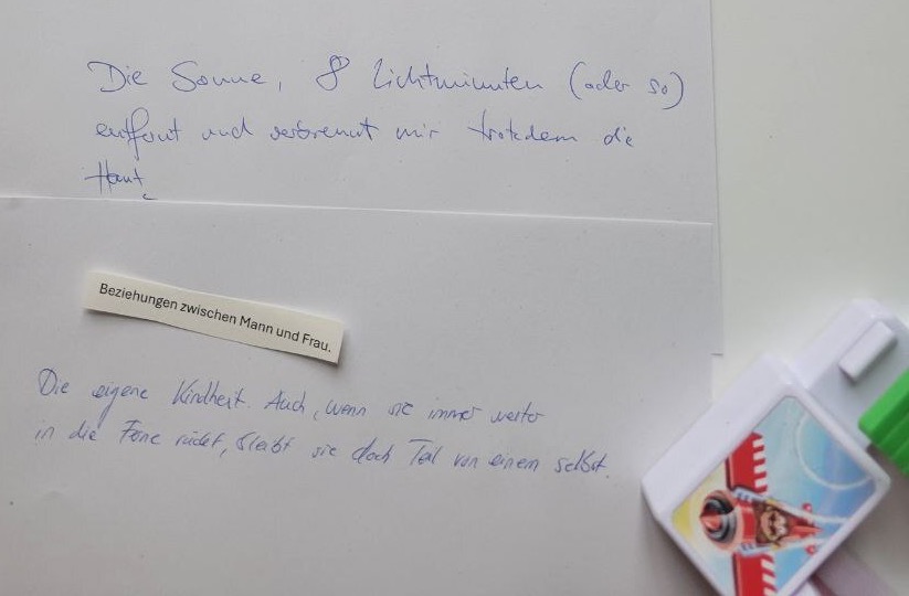 Die Welt neu entdecken. Aber wie geht das? Zum Beispiel so: Auf einer unbekannten Insel stranden, eine Flaschenpost schreiben, Diamanten suchen und Wolkenbilder enträtseln. Die große Reise geschieht durch Arbeit an drei verschiedenen Stationen, verteilt über zwei bis drei Räume.